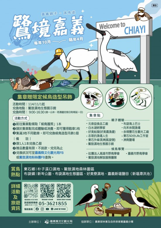 | 二、 | 為推廣親子賞鳥旅遊,該局規劃辦理「嘉義縣親子賞鳥遊」《集章贈限定候鳥造型吊飾》活動。 |