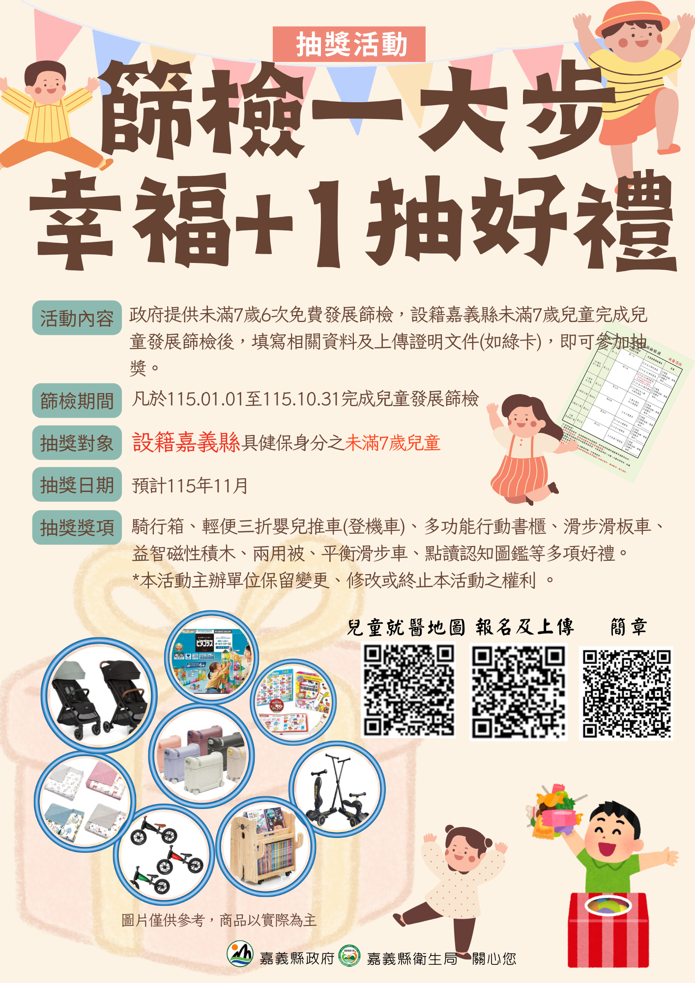 轉PO民雄衛生所訊息:今年戶籍在嘉義縣 有完成兒童篩檢的小朋友,家長可以參加抽獎活動~